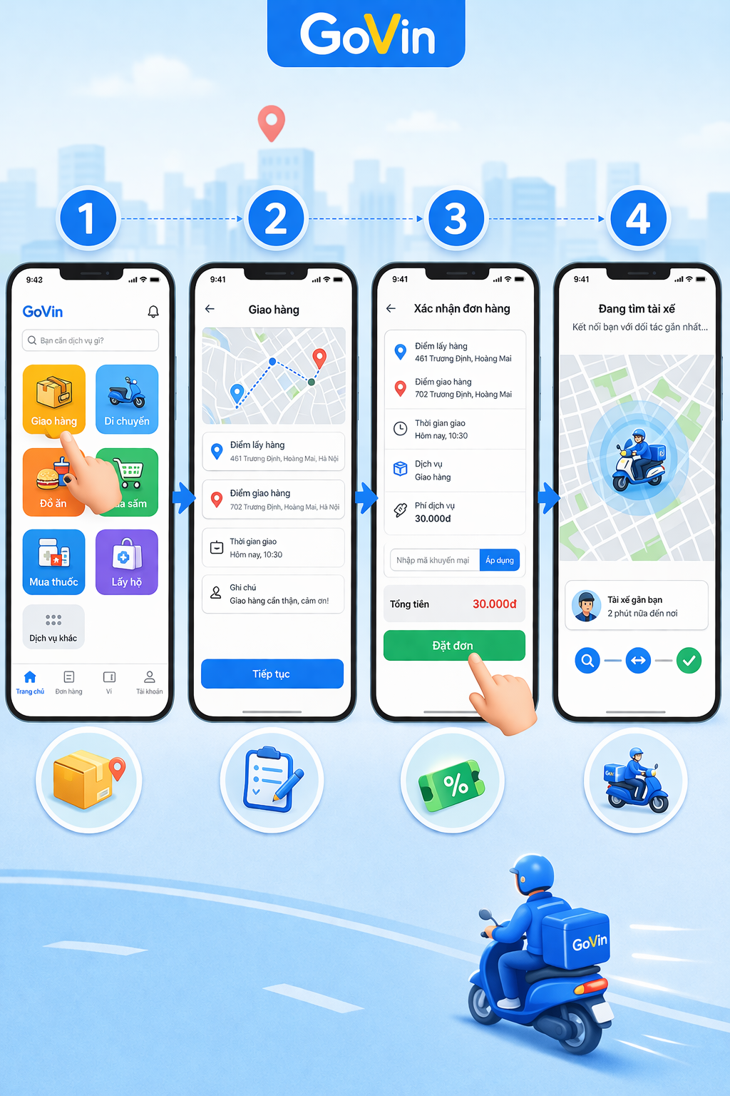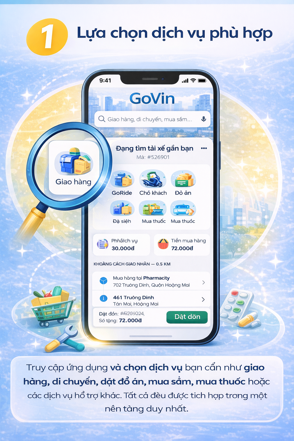 Từ giao hàng, di chuyển đến sửa chữa và vệ sinh, GoVin giúp bạn tiếp cận nhiều dịch vụ khác nhau chỉ trong một nền tảng. Không cần tìm kiếm nhiều nơi, mọi nhu cầu đều được kết nối nhanh chóng ngay trên ứng dụng.